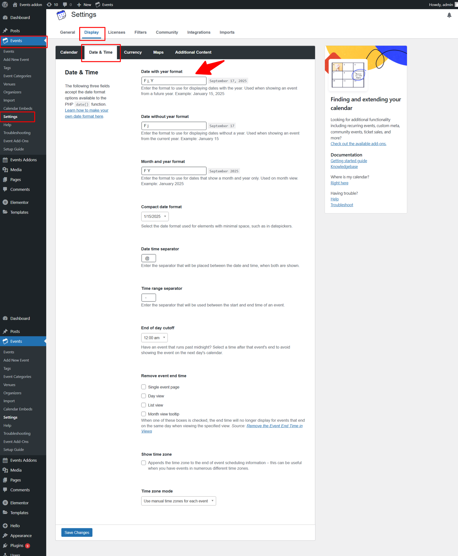 • From your WordPress dashboard, go to Events → Settings → Display → Date & Time.