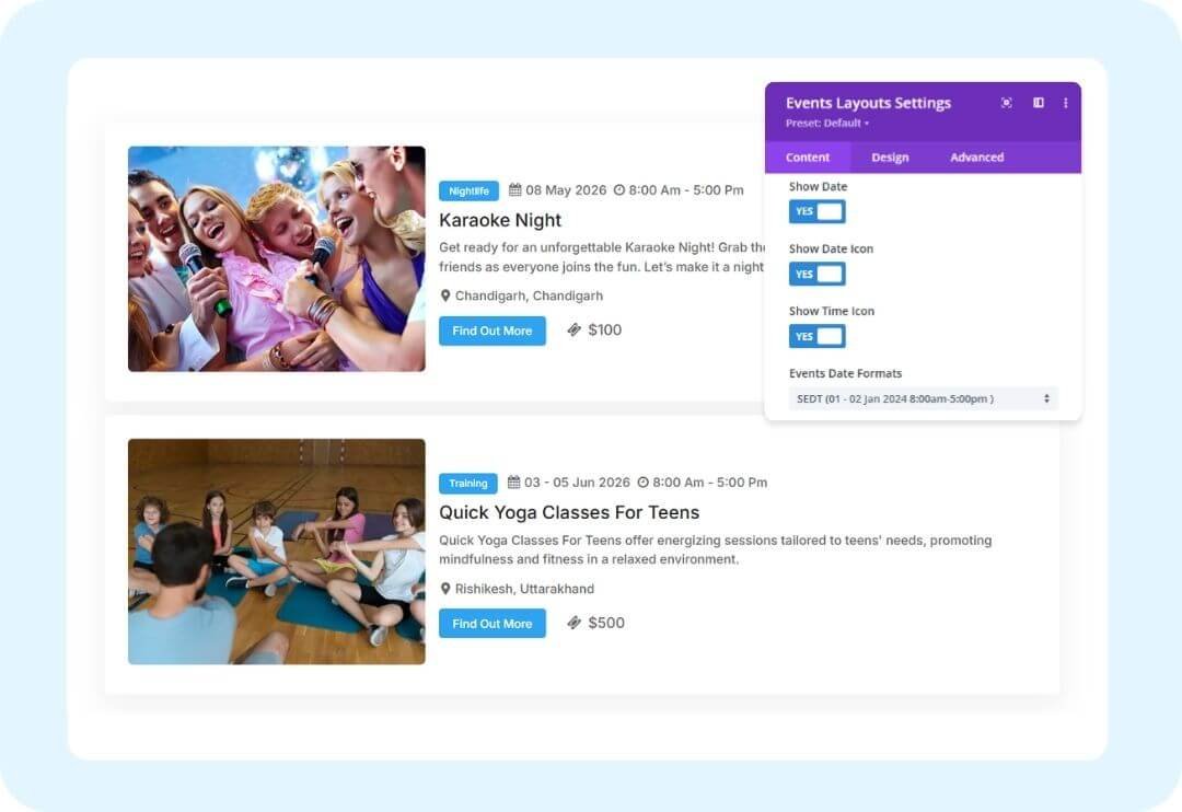 Display your events in grid, slider, or carousel layouts using shortcodes.