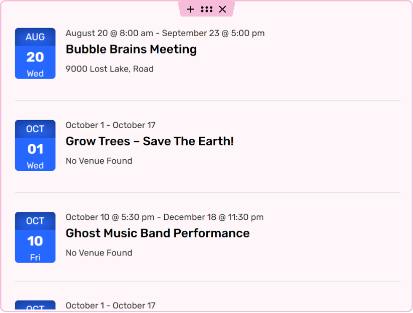 Display your events in grid, slider, or carousel layouts using shortcodes.